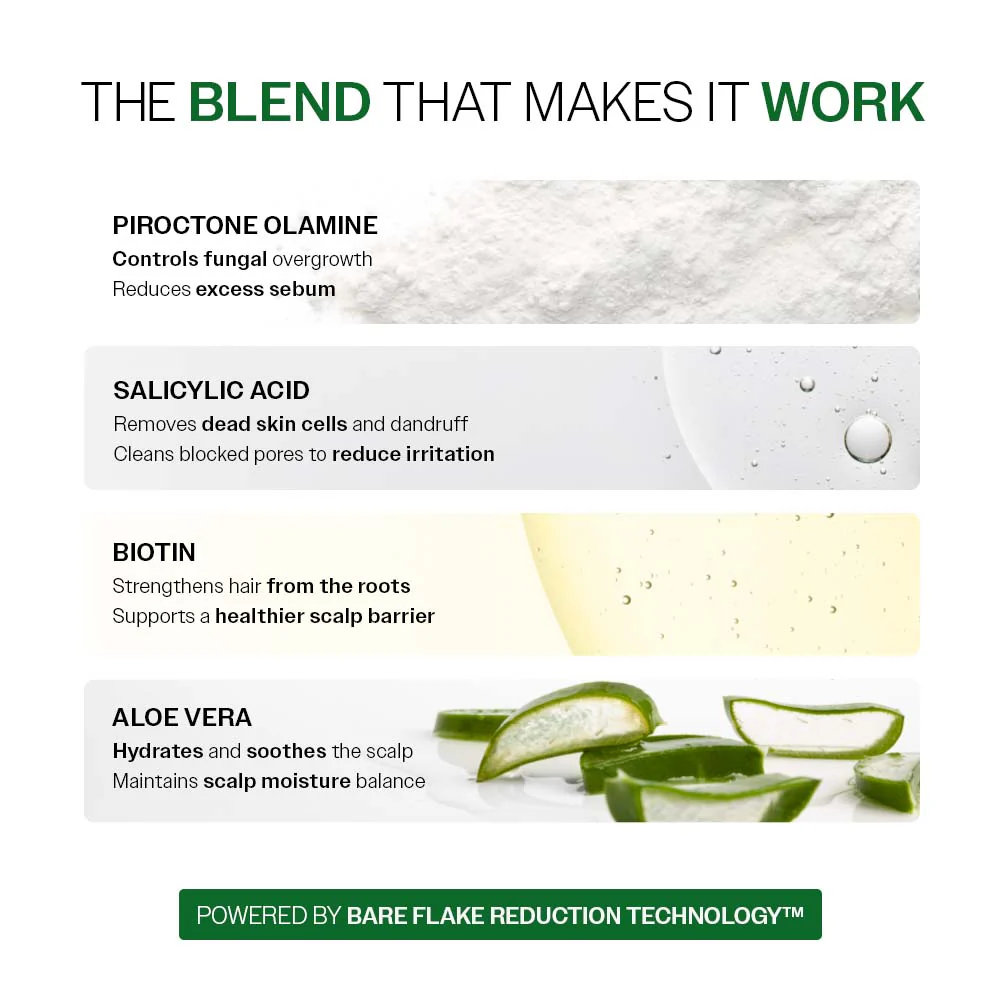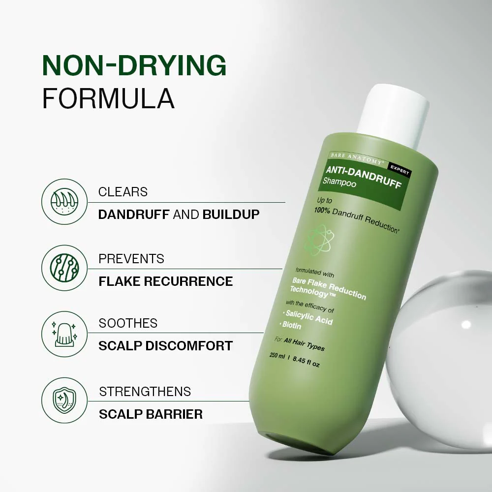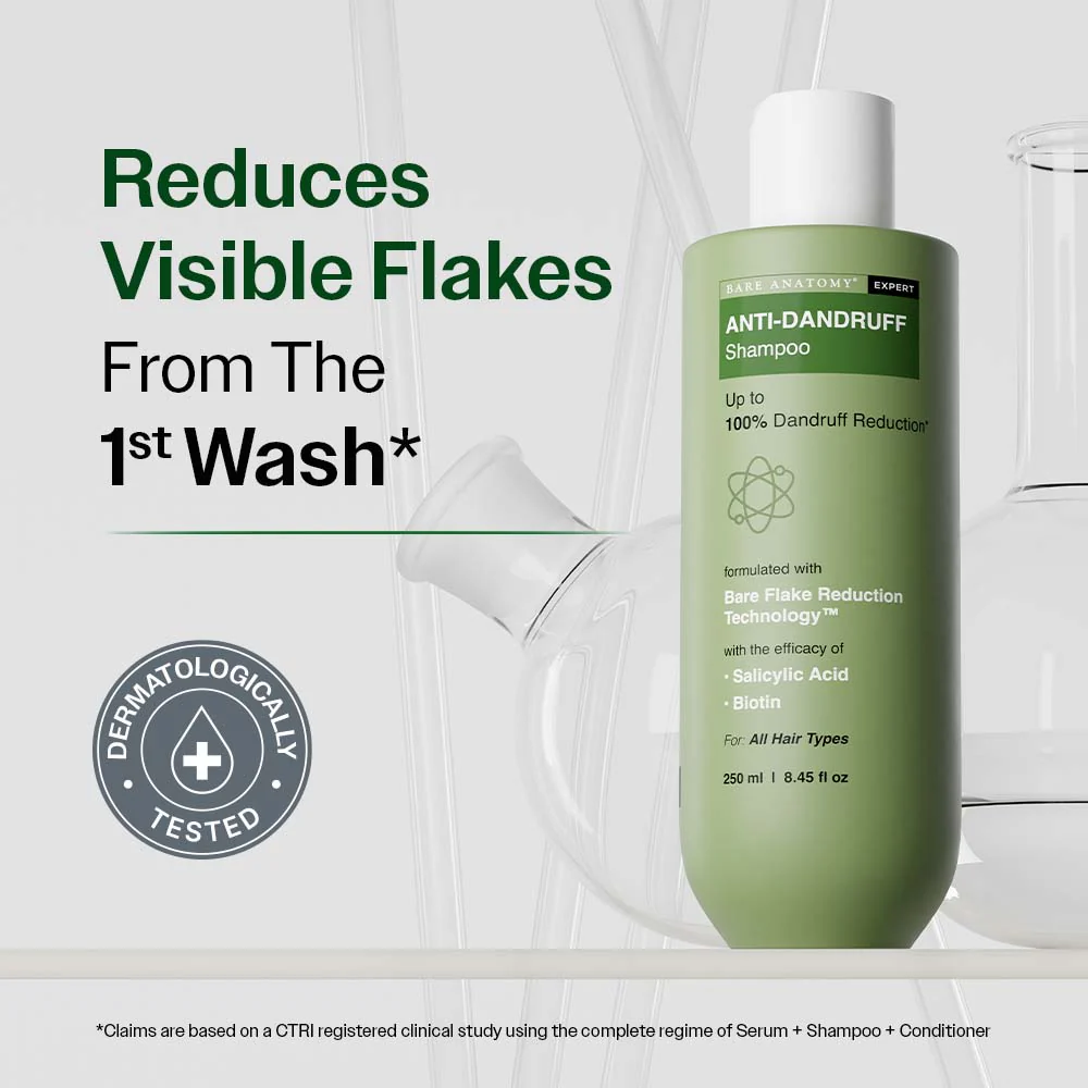 Bare Anatomy EXPERT Anti-Dandruff Shampoo is clinically proven to reduce upto 100% dandruff in 3 washes*.