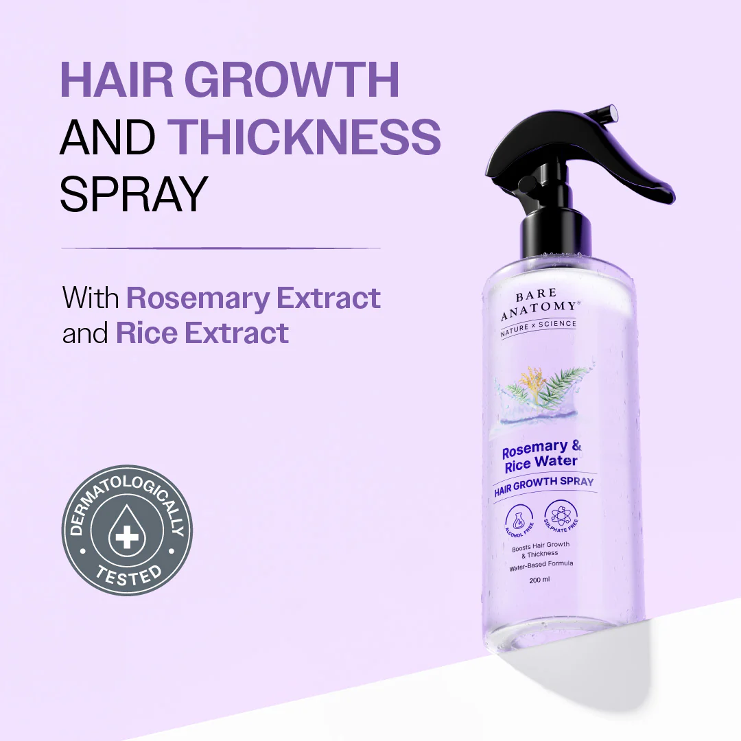 Bare Anatomy Rosemary & Rice Water Hair Growth Spray, powered by Innovist, is a 100% natural, daily-use hair spray that promotes visible hair growth, boosts thickness and reduces hair fall. Lightweight and non-greasy, this hair growth spray absorbs quickly into the scalp without clogging follicles or leaving residue.